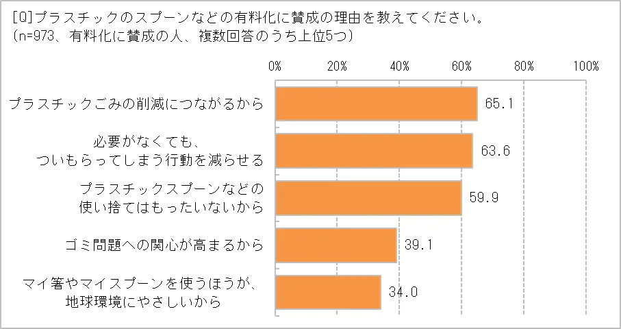 7割近い人が有料化を「賛成」と回答。理由としては、「プラスチックごみの削減につながるから」65.1%、「必要がなくてもついもらってしまう行動を減らせる」63.6%、「プラスチックスプーンなどの使い捨てはもったいないから」59.9%などが挙がっています。