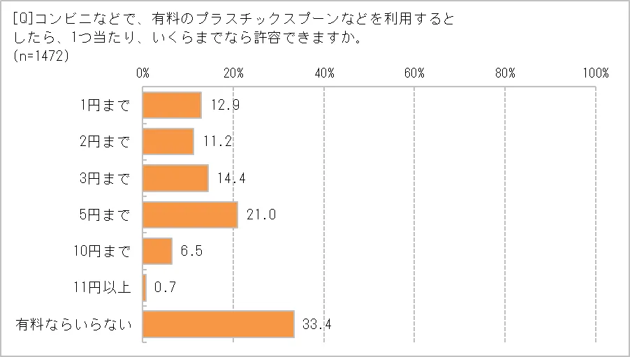 プラスプーン・フォークを有料化した場合、何円までなら払うか聞いたところ、1位はダントツで「有料ならいらない」33.4%で、2位の「5円まで」21.0%を大幅に上回る結果に。「ほぼ家で食べるので、必要ないと感じていた」(30代・専業主婦)のように、なんとなくもらっていたけれど断るという声もあり、ある程度の抑止力になりそうです。