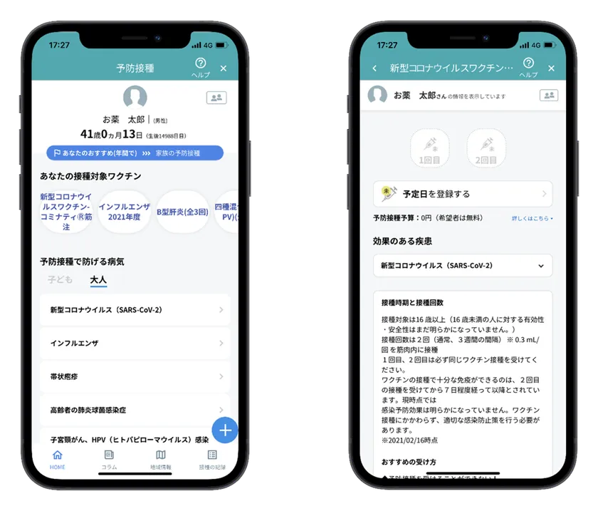 2020年11月に年齢層別に接種対象ワクチンを表示する、予防接種スケジューラー機能をリリースしました。今回「新型コロナウイルス」の項目を追加。接種予定日、接種有無、接種場所、接種ワクチンの記録、登録しているユーザーとの情報共有が可能です。