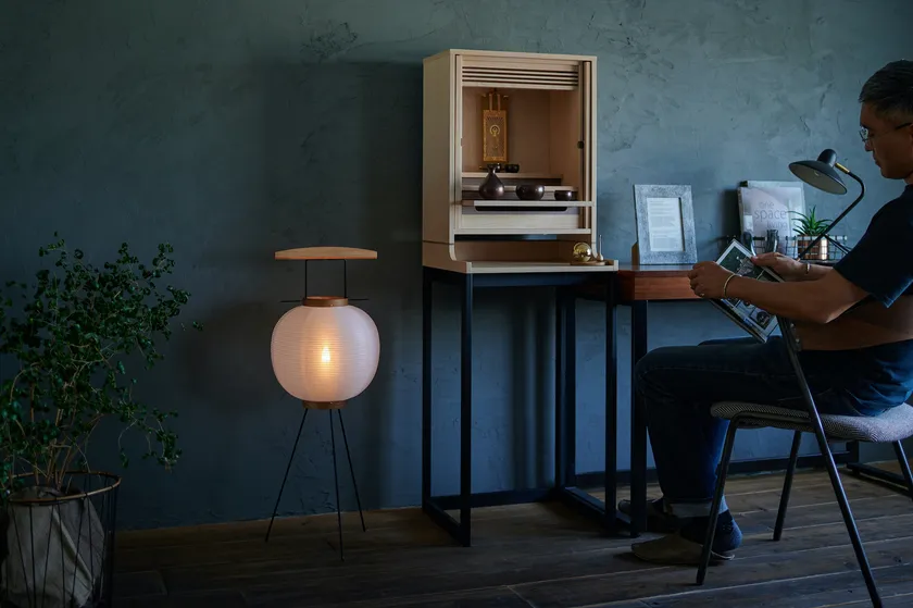 近年、モダンなデザインや小型のお仏壇の人気が高まる一方、盆提灯は伝統的なデザインのものが中心でした。「和」の印象が強かった昔ながらの三つ足型の盆提灯(大内行灯)。新作「AGASATO」は、三つ足型の特徴である脚をブラックスチールに置き換えることで、伝統的な様式を守りながら今のライフスタイルに合うデザインに仕上げました。