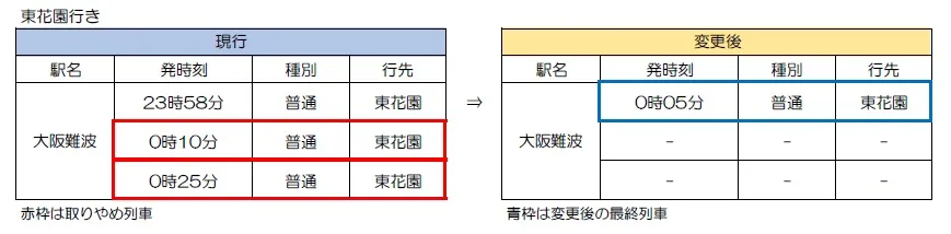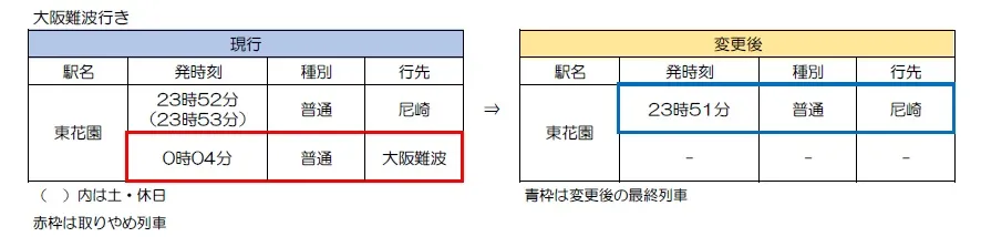 (2)東花園・大阪難波間の最終列車を東花園23時51分発とし13分繰り上げます。