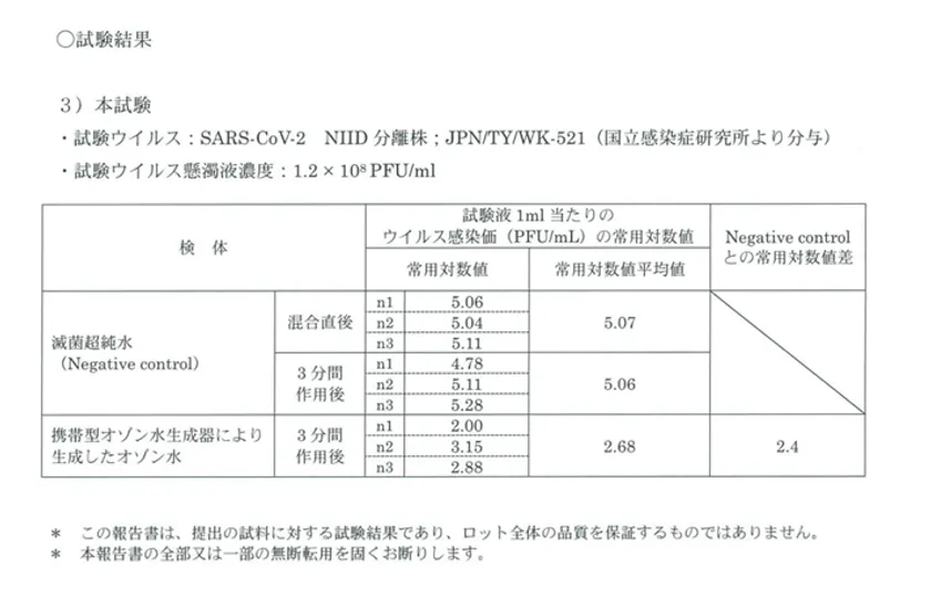 これによると、減菌超純水が5.06に対し、本オゾン水は2.68で、その常用対数の差は2.4となります。このことにより、計算上、新型コロナウイルスが約99.6%減少し、不活化したことが確認できました。