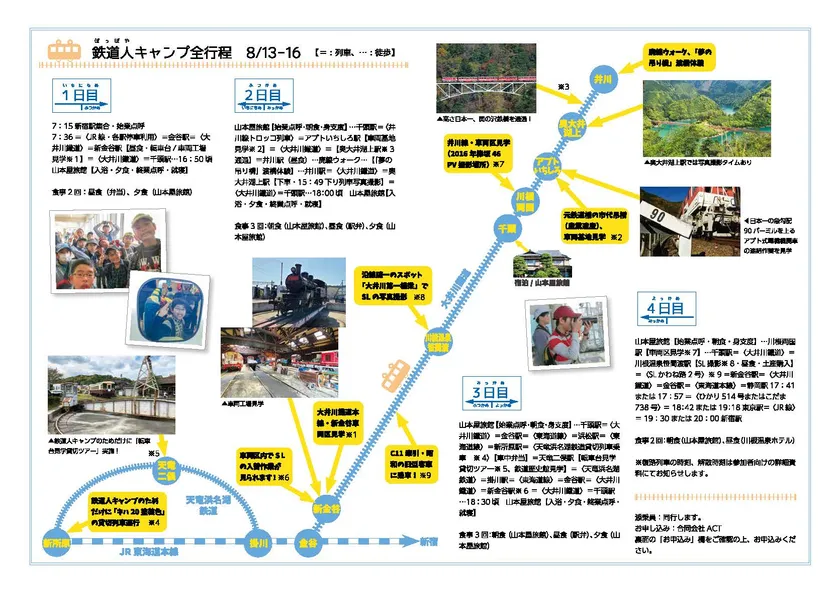 学校の教育旅行の企画・手配を行う合同会社ACT(所在地:東京都府中市、代表社員:中嶋 信)は、鉄道好きな子ども向けの夏休みのコンテンツとして、大井川鐵道株式会社とのコラボレーション企画、大井川鐵道を完全制覇できる4日間のツアー『鉄道人(ぽっぽや)キャンプ』を、2021年8月13日(金)~16日(月)に実施いたします。