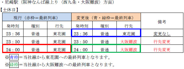 平日・土休日とも「尼崎23:50発〈普通〉東花園行き」、「尼崎24:00発〈普通〉東花園行き」の2列車の行先を「大阪難波行き」に変更します。これに伴い、近鉄線各駅への最終列車が変更となります。
