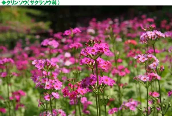 谷間のほとりや山地の湿地に生える多年草で、日本に産するサクラソウ属の中では最大のものです。1本の花茎に2cm前後の花を輪状に付け、さらにこの輪が何段にも咲きあがっていく姿が仏塔の九輪を思わせるところから「クリンソウ」という和名が付けられています。兵庫県では年々自生地が少なくなっており、兵庫県の絶滅危惧植物に指定されています。当園に咲くクリンソウは、5月末までお楽しみいただける見込みです。