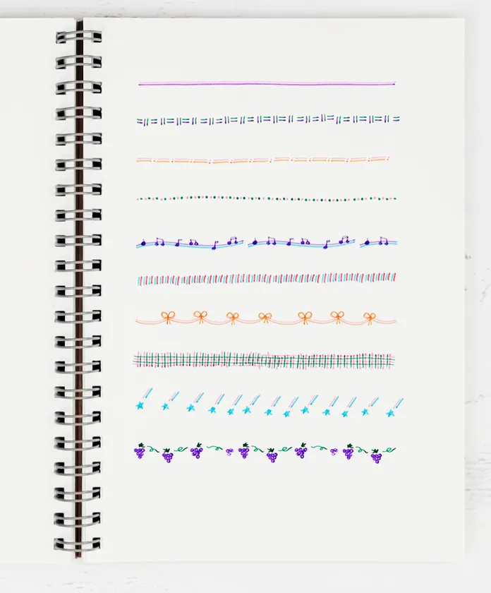メッセージカード・ノート・手帳などをまとめたり、デコレーションする際、2色線で線(実線・点線・波線など)を引くだけでも仕上がりを引き立たたせることができるため、イラストを描くことが苦手な方にもオススメです。