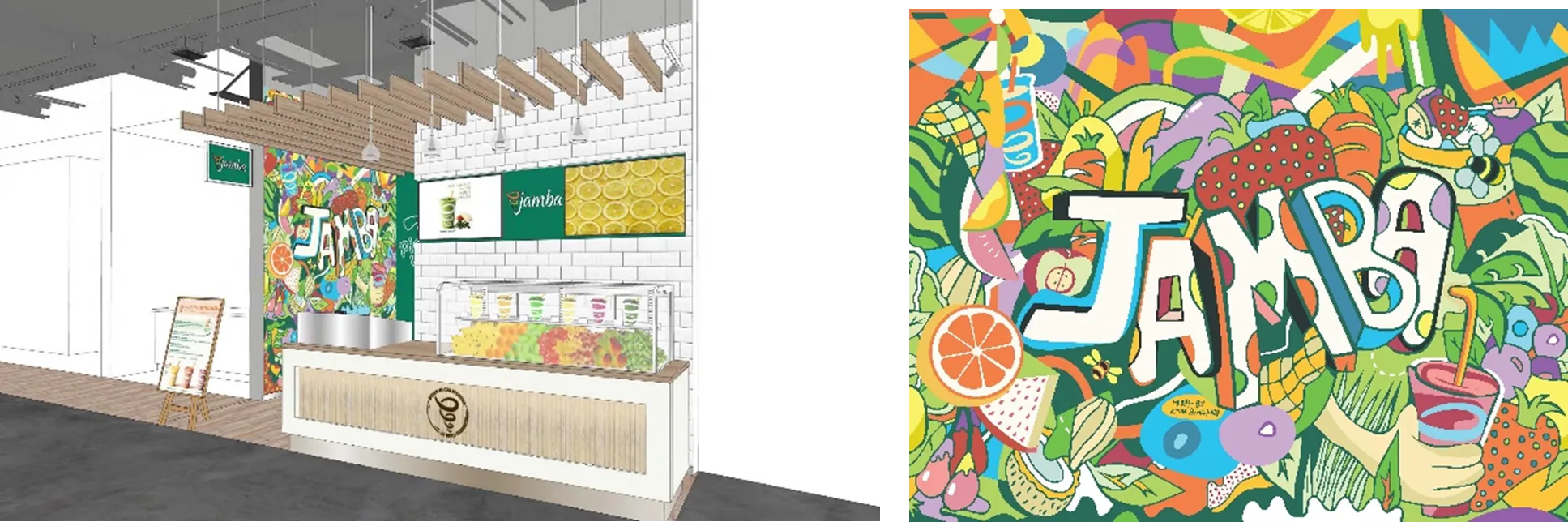 店内は、ビタミンカラーが目を惹くカラフルなミューラル(壁画)が特徴のデザインで、ご来店いただくお客様を明るく元気に迎え入れます。また、ミューラルに大きくあしらわれた「Jamba」の文字とスムージーに入っている沢山の果物・野菜を体現。ポジティブで元気で、カラフルな#Jambaのある生活 を表すPOPなデザインで、写真映えもするアートなフォトスポットとなっています。