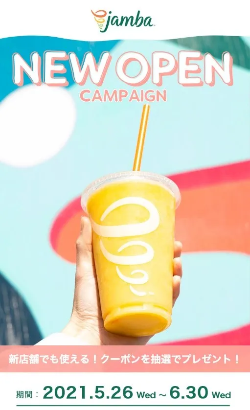 Jambaのオープンを記念して2021年5月26日(水)~6月30日(水)の期間中、「Jamba Japan Official」のInstagramアカウントをフォローいただいた方を対象にスムージーをプレゼントする素敵なキャンペーンを実施いたします。 “Jambaのある生活“を取り入れ心躍るサマーシーズンをお楽しみださい。