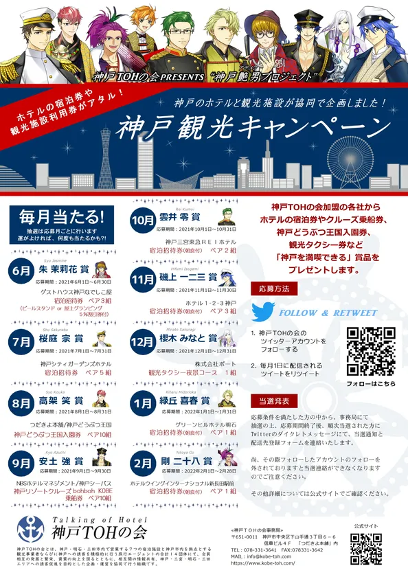 神戸TOHの会(神戸アーバンホテル協議会)は、2021年6月~2022年2月までホテル宿泊券や観光施設利用券が当たる神戸観光キャンペーンとして、神戸のホテルが共同で神戸を盛り上げる「KOBE 艶男(アデメン)プロジェクト」を立ち上げました。