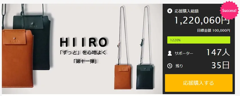 HIIRO's Leather seriesでは、スマホの持ち運びに便利な『プラスするポケット』を、2021年4月23日より、今話題のクラウドファンディング、マクアケにて支援者募集の新プロジェクトを実施。公開初日に目標金額500%を達成、5月24日現在1,000%突破しました。