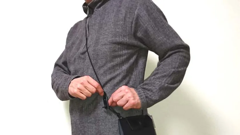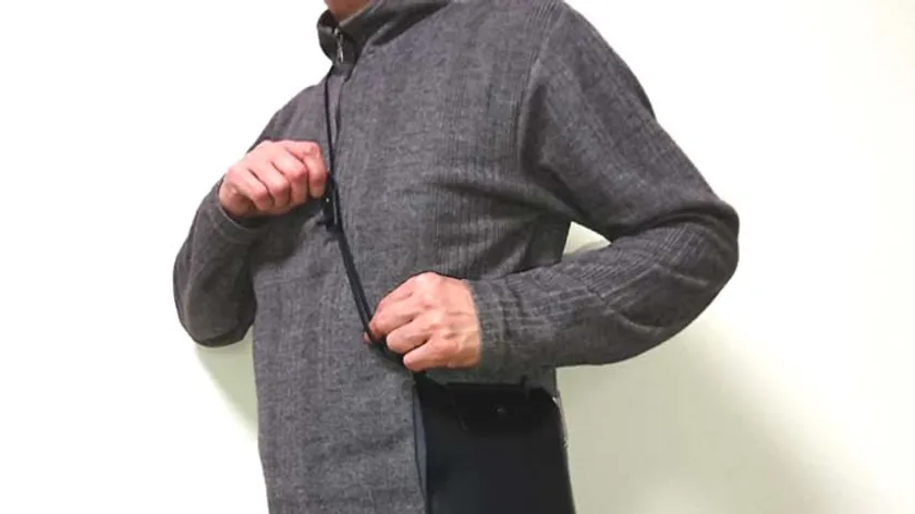 2. 手がすっぽり入るポケットサイズ。ストラップは肩に掛けたまま長さ調節OK。