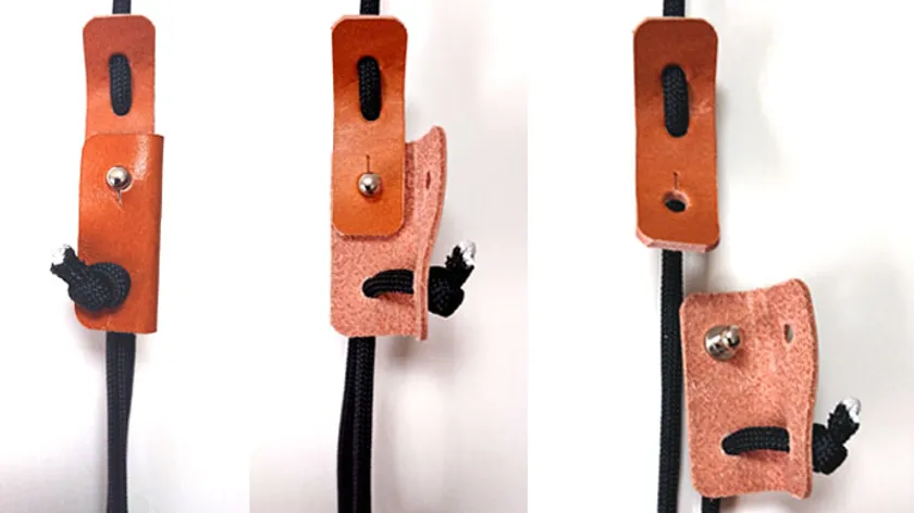 調節部はテントに使う自在金具から発想しました。ストラップは調節部で簡単着脱。ベルト装着時に邪魔になりません。ストラップひもは丈夫で絡みにくいパラシュートコード(パラコード)採用。