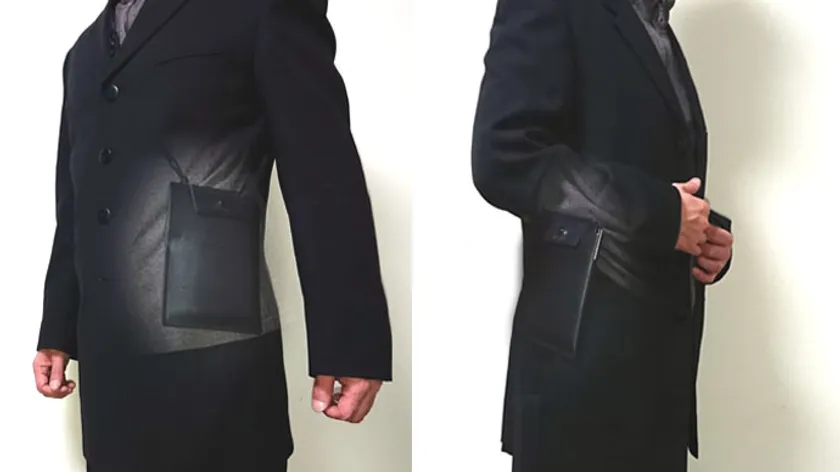 ジャケットの下でもカッコイイ。拳銃のホルスターからヒントを得た『動ける』二つの忍ばせポジション。