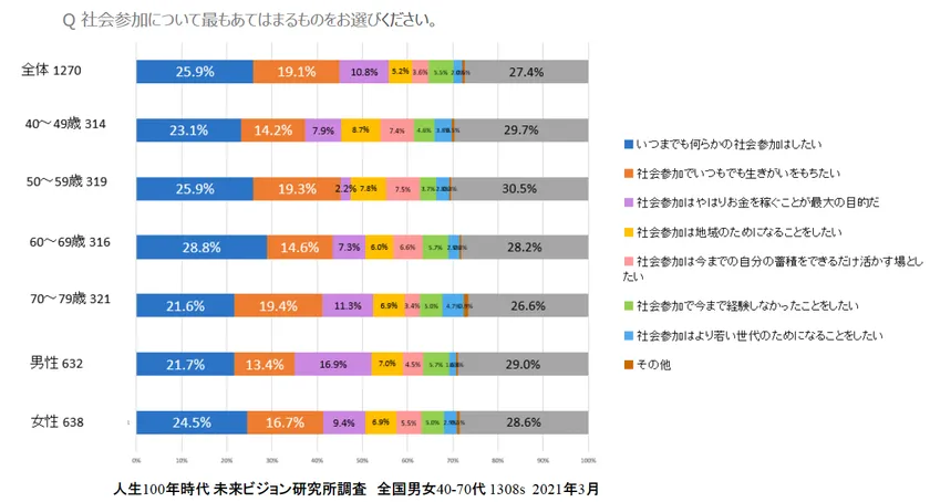 ■「社会参加」の1位「いつまでも何らかの社会参加」、2位「いつまでも生きがいを持ちたい」、3位「おカネ」40-70代に「社会参加」について聞いてみると1位は「いつまでも何らかの社会参加はしたい」、2位が「社会参加でいつまでも生きがいを持ちたい」、3位が「社会参加はやはりおカネを稼ぐことが最大の目的だ」となった。「おカネ」より先に、「いつまでも、社会参加したい、生きがいを持ちたい」が上位に上がっています。