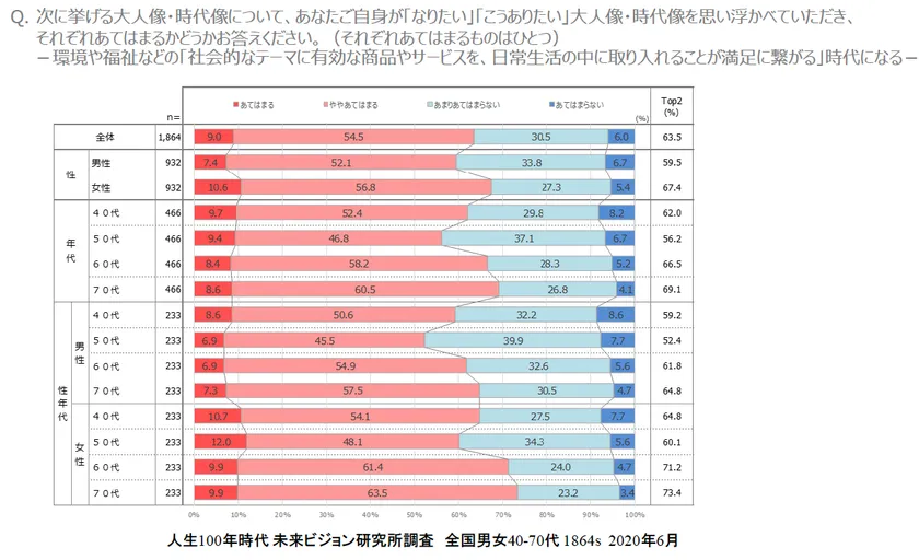 「環境・福祉など社会的テーマに有効な商品・サービスを生活に取り入れる時代になる」ことに対しても40-70代の63.5%が共感すると答えました。また、それは60代66.5%、70代69.1%と、60・70代が高く、年代が上がるにつれて高くなる傾向にあり、社会性を持っています。実際これまでもこの年代ではクルマでハイブリッド車やEV、リフォームで太陽光発電などが支持されて来ました。高級セダンから小型のハイブリッド車への乗り換えということも起こりました。