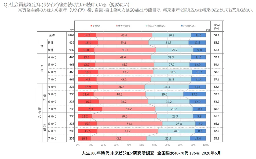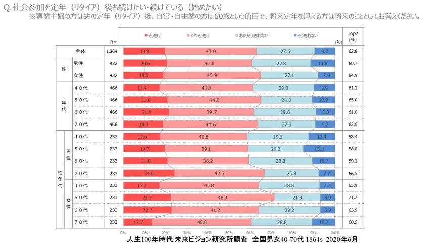 40-70代で「社会参加を定年(リタイア)後も続けたい(始めたい)」は、62.8%で、男女別でも、またどの年代でも