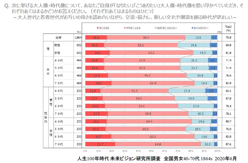 ■「大人世代と若者世代が交流・協力し、新しい文化や潮流を創る時代が望ましい」は75.8%。