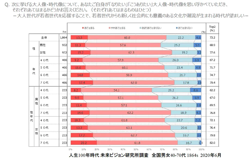 ■「大人世代が若者世代を応援し、若者世代から新しく意義のある文化や潮流が生まれる時代が望ましい」は73.2%。