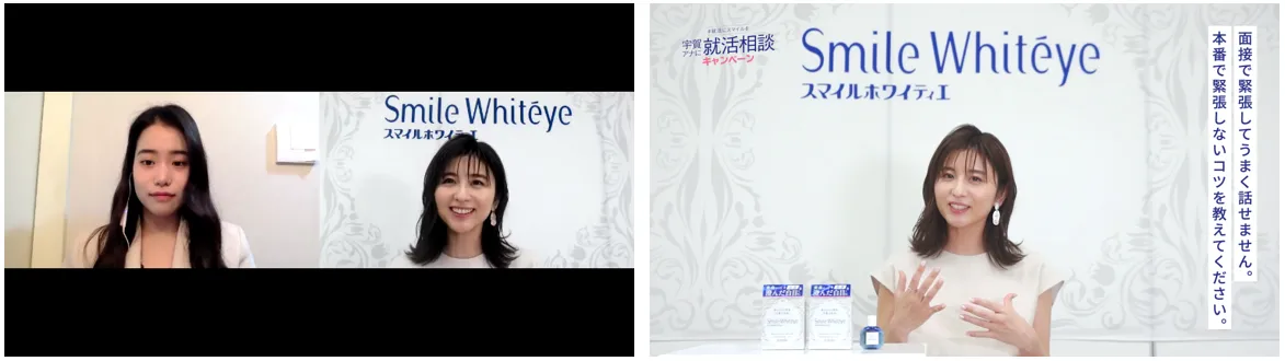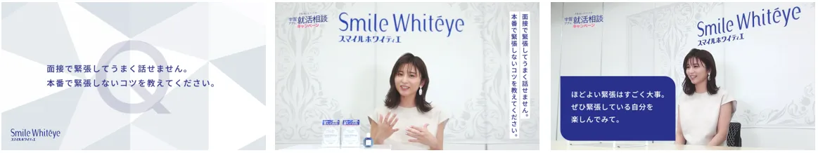 事前に就活生から募った悩みに対して、宇賀さんがアドバイスをする動画を公開いたします。動画では3名の就活生の「本番で緊張しないためのコツは?」「対面で会えないため、会社の雰囲気をきちんと理解できているのか不安」「オンライン面接でどのように印象アップすればいいか分からない」といった悩みに、宇賀さんが具体的に答えています。詳細はスマイルホワイティエ公式Twitterアカウントをご確認ください。