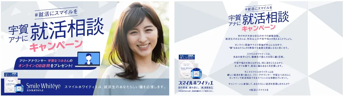 『スマイルホワイティエ』は、充血を素早くとり、健康的で澄んだ白目に導く目薬です。新型コロナウイルスの影響でオンライン面接やマスク面接が中心になる中で“瞳”は自分らしさを伝える重要な武器になると考えています。例年よりも不安や悩みを抱えることになる中、自分らしい就職活動を応援する為、オンラインで就活相談ができる特別なプレゼントキャンペーンを実施しました。