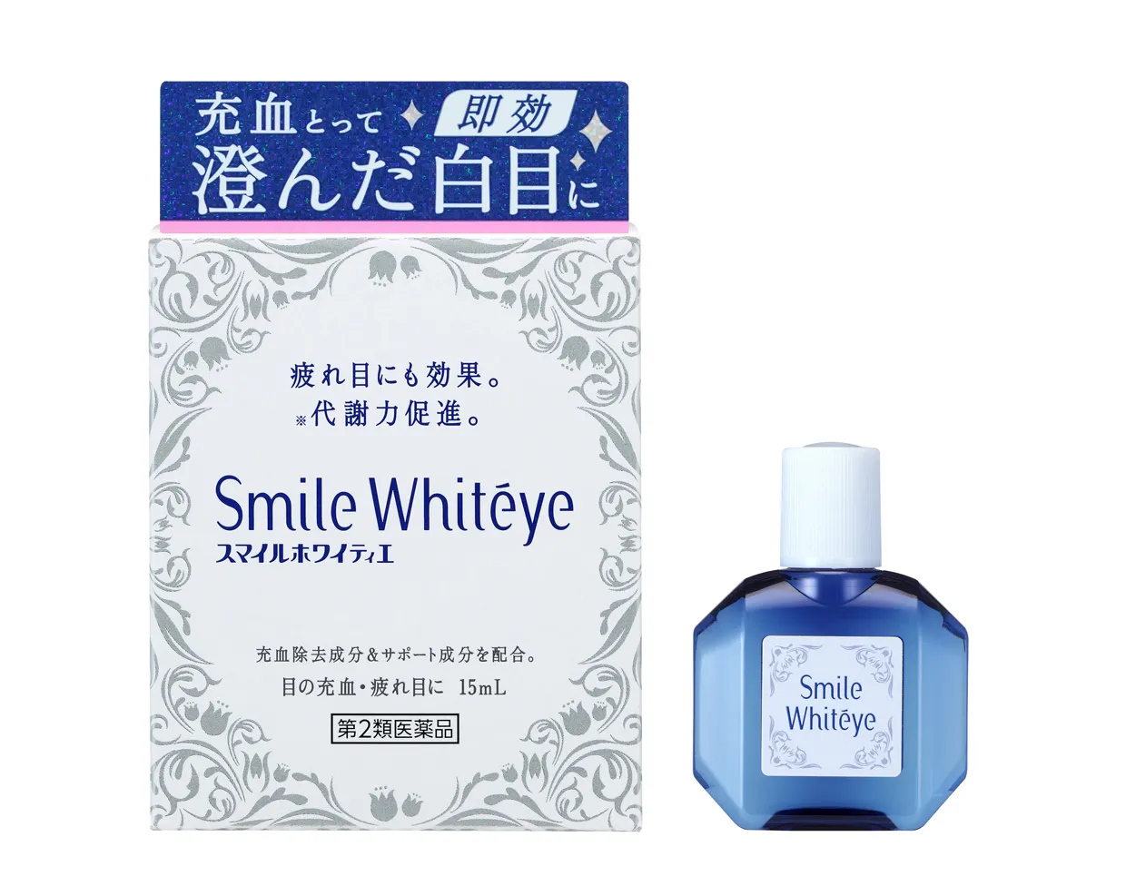 『スマイルホワイティエ』は、充血を取って、輝く澄んだ瞳に導く目薬です。充血除去成分とその働きをサポートする成分を配合。素早く充血を除去し、澄んだ白目に導きます。また、代謝力促進成分で、栄養と酸素を補給し新陳代謝を促進。疲れた瞳を癒します。