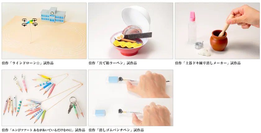 「ラインドローン☆」「具で箱ラーペン」「土器ドキ練り消しメーカー」「エンぴツアート あながあいているだけなのに」「消しゴムパンチペン」