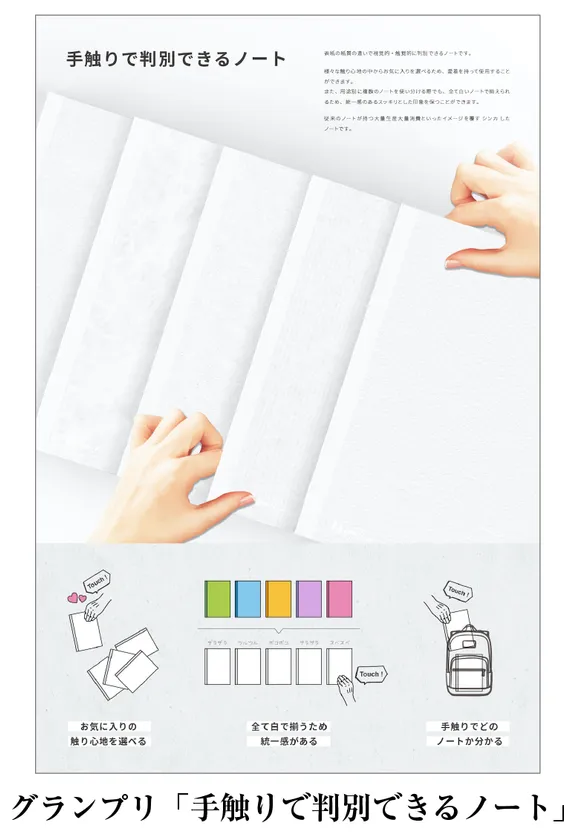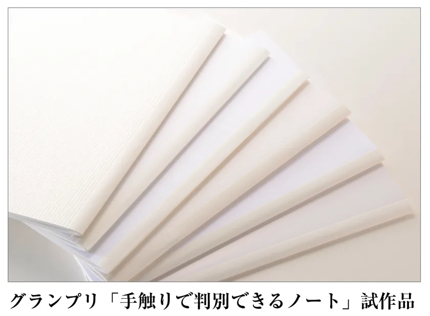 一般部門グランプリを受賞した『手触りで判別できるノート』は、表紙の紙質の違いによって視覚的・触覚的に判別できるノート。様々な触り心地の中からお気に入りを選べるため、愛着を持って使用することが可能な商品アイデアです。本作品は、日常生活で忘れがちな指先の高感度な触感の真価に気づかせてくれる点や、人と道具がお互いの能力を引き出し合う関係が、両者の進化を促すことを示唆している点が高く評価され、受賞しました。