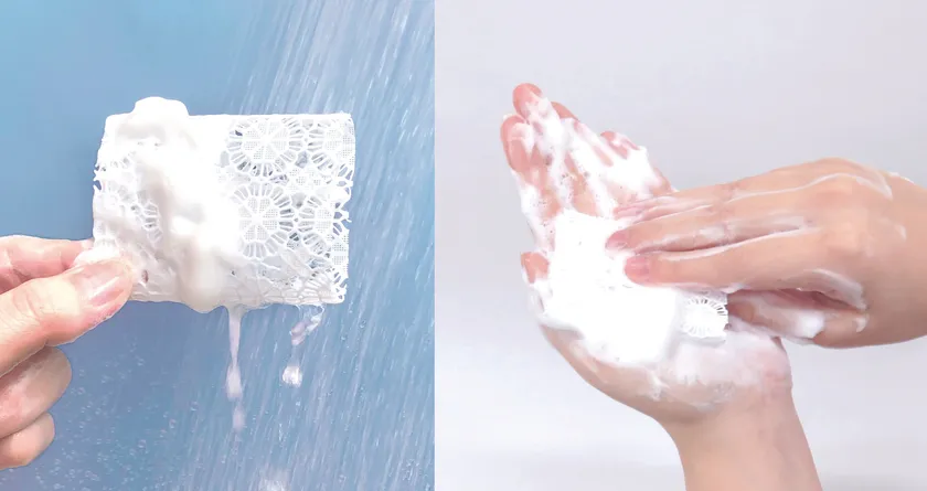 レース調素材で泡立てもすすぎもとにかく早い、しかも乾きも早いので衛生的です。泡立てネットを「めんどくさい」という理由で使っていない方や時間がない方に最適な泡立てネットを開発しました。
