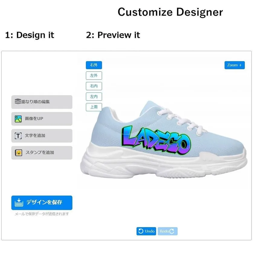 ladecoのオリジナルデザインのシューズやバッグの元となる製品のカラー・サイズのバリエーションは5,000点を超えます。幅広い選択肢の中から自分だけのオリジナル製品を作ることができます。また、デザインは直観的操作ができる各種デザインツール・アプリに対応。デザインに不慣れな方でも簡単にカスタマイズしてシューズやバッグを製作することが可能です。アパレルブランド・アーティスト等とのコラボも予定しています。