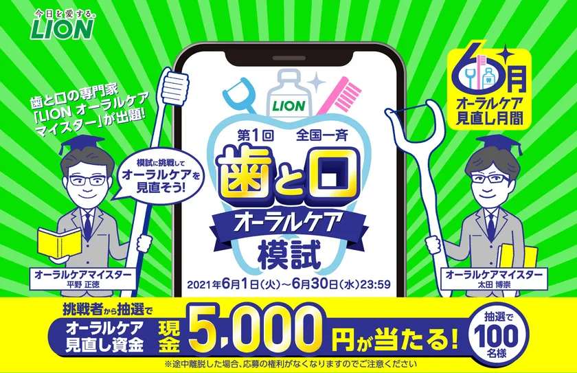 ライオン株式会社(代表取締役社長・掬川 正純)は、6月4日~10日の「歯と口の健康週間」に合わせて6月を「オーラルケア見直し月間」と位置づけ、歯と口に関する正しい知識を楽しく身につけていただくためのWEB模試を、2021年6月1日(火)から実施します。模試に挑戦した人の中から抽選で100名に、オーラルケアを見直していただくための資金5000円が当たります。