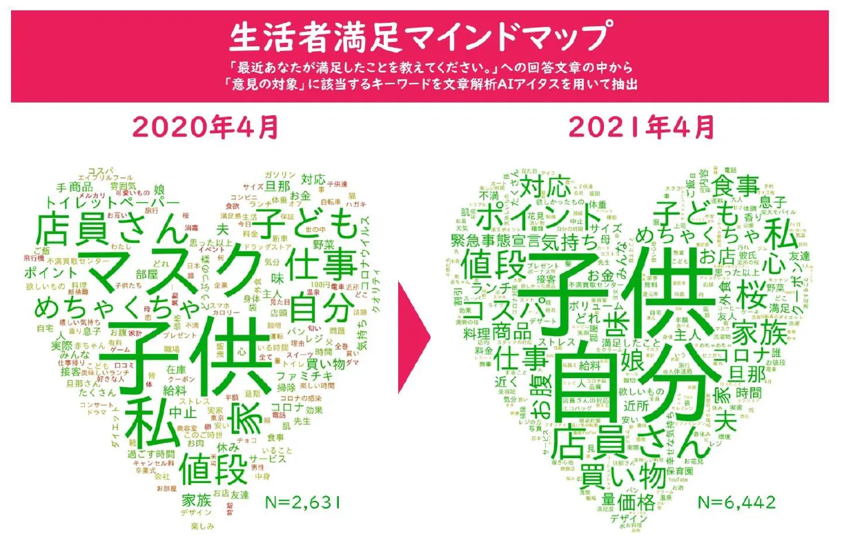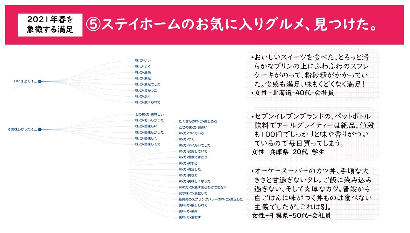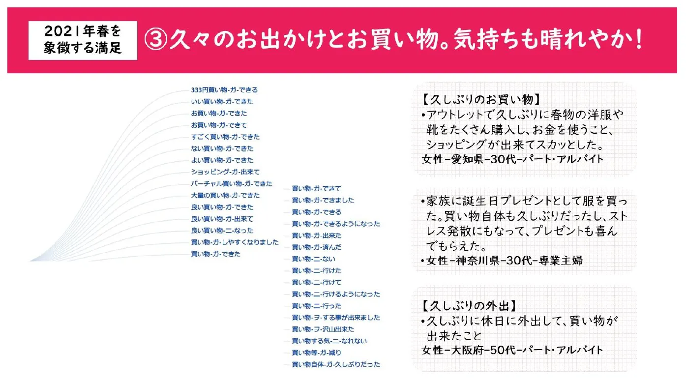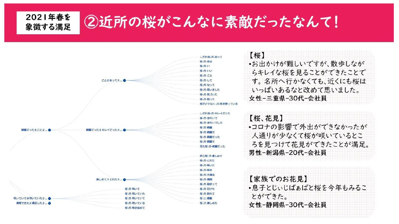 「桜」をキーワードにする満足からは「コロナの影響で外出が出来なかったけれど近所の桜がこんなに素敵だったなんて」というちょっとした気づき・発見が満足につながっている状況がうかがえます。