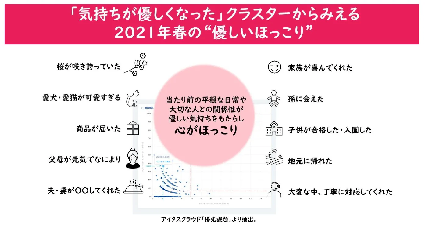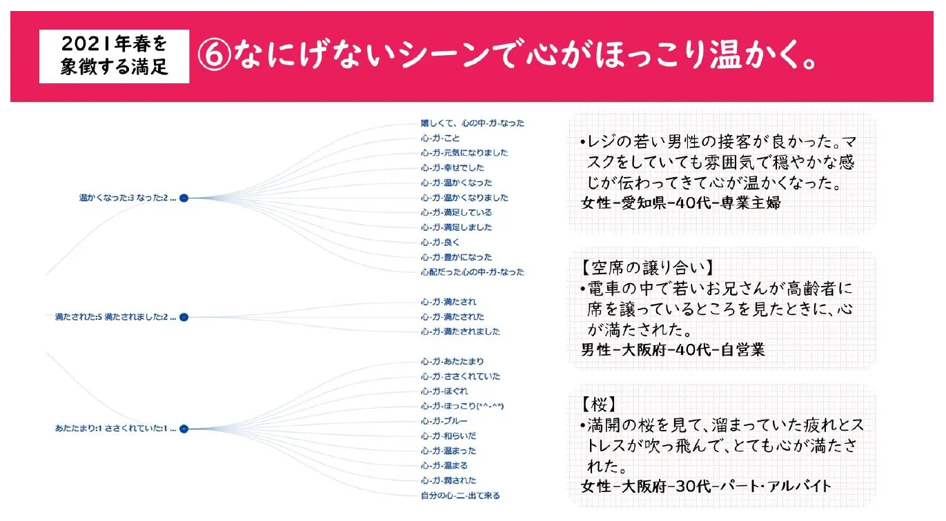 2021 年春に生活者が「気持ちが優しくなれた」と感じた典型的な満足シーンは以下の通りです。