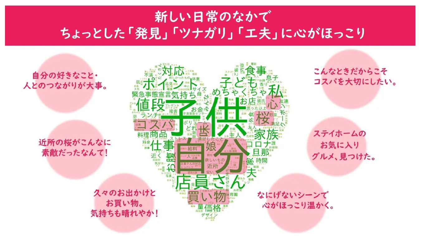 家族や地元、ペットとのつながりや季節の変化など、当たり前の平穏な日常や大切な人との関係性が優しい気持ちをもたらしていることが分かります。「大変な中、丁寧に対応してくれた」との意見もあり、新型コロナ感染症の終息が見えないなかだからこそ、お互いにおもいやり、優しい気持ちを拡げていくことが日々の満足感・自己肯定感を高めるカギになっていると言えます。社会全体にこんな「優しいほっこり」が拡がっていくことを願ってやみません。
