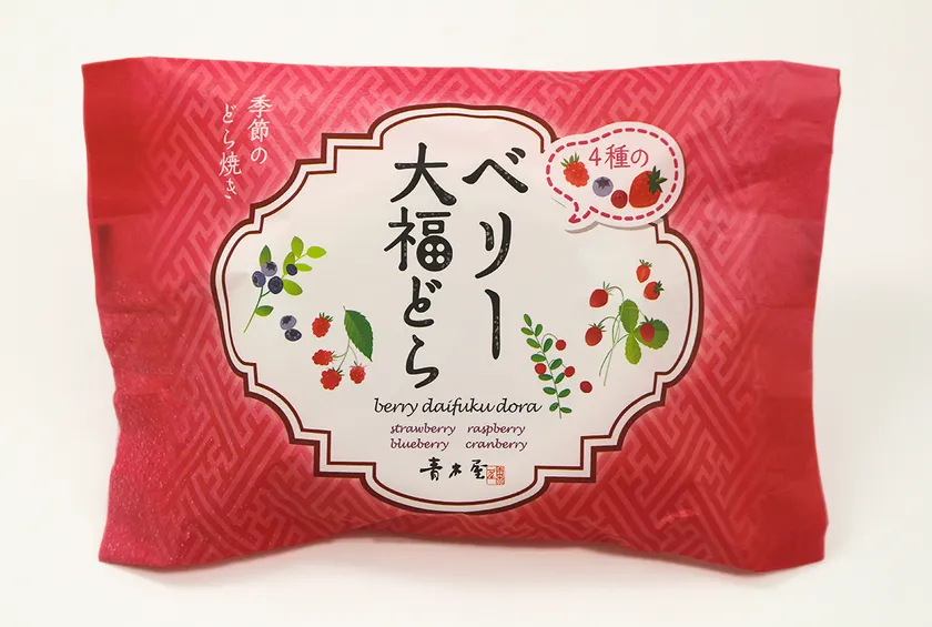 ラズベリー、ストロベリー、ブルーベリー、クランベリーの4種のベリーを使った甘酸っぱいベリー餡をもちとろ食感の大福生地で包み、プレーン生地のどら皮ではさみました。
