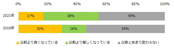 「最近の求人状況をどのように感じていますか?」と伺ったところ、最も多かった回答は「あまり変わらない」(45%)でした。「以前より良くなっている」は17%、「以前より厳しくなっている」は38%の結果になりました。