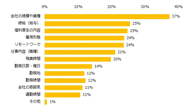 仕事を探す際に妥協できる条件を伺ったところ、第1位は「会社の規模や業種」(37%)。次いで「時給(給与)」(25%)、「福利厚生の内容」(25%)が同率でした。