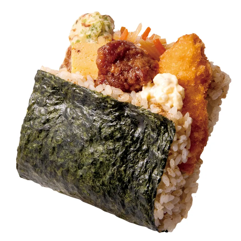 白身フライ、タルタルソース、ちくわ天、唐揚げ、玉子焼き、きんぴら、おかかの7種具材を丁寧に包んだ、まさにのり弁のようなおにぎりです。