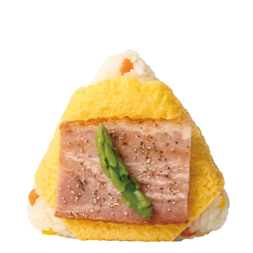 ベーコン、たまご、アスパラをピラフに乗せた彩り鮮やかなおにぎりです。