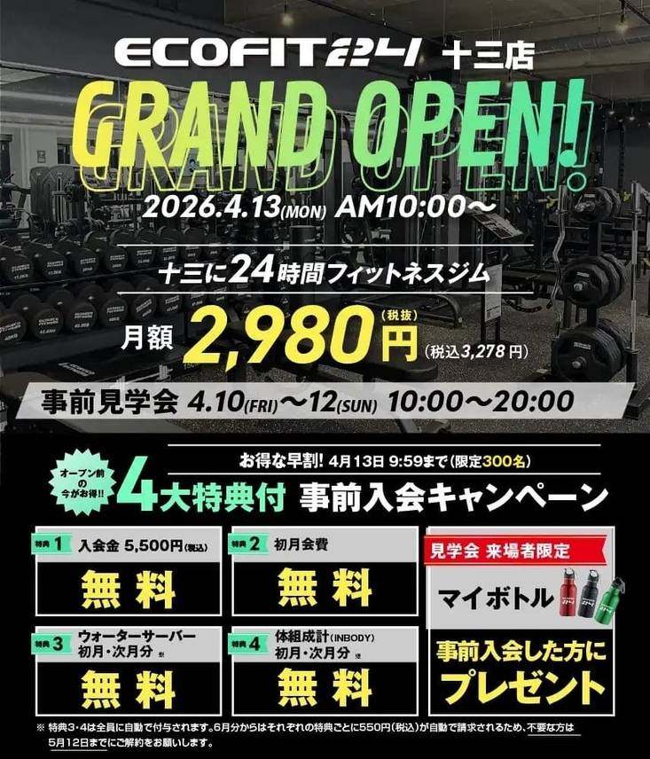 エコフィット24 十三店では、グランドオープンに先立ち、事前見学会を開催いたします。施設内をご自由にご見学いただけるほか、マシンや設備をご確認いただけます。見学は予約不要で、開催時間内であればお好きなタイミングでご来館いただけます。
