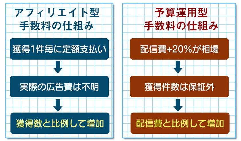 代理店に依頼する場合、CVを1件獲得する度、あるいは広告予算に対しての%で手数料が発生します。つまり、配信量が増えれば増えるほど仲介コストも増え続ける形です。