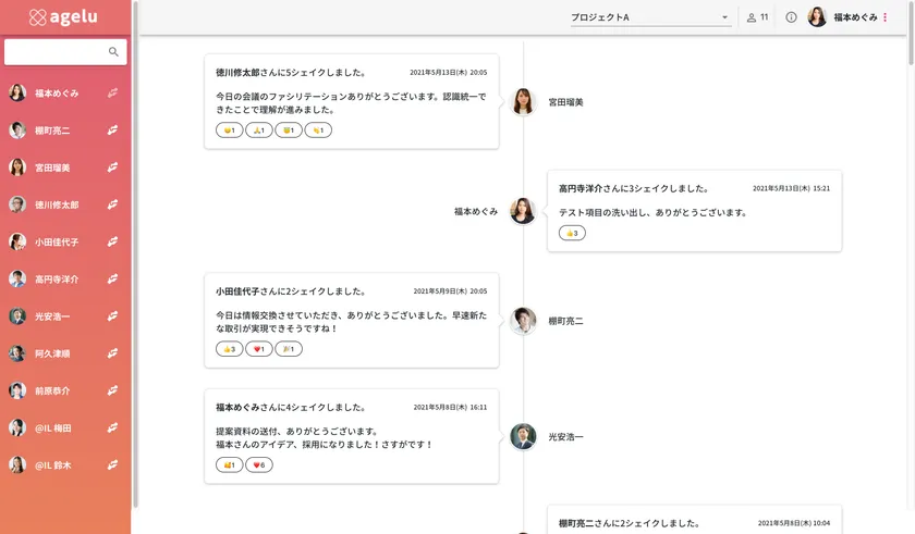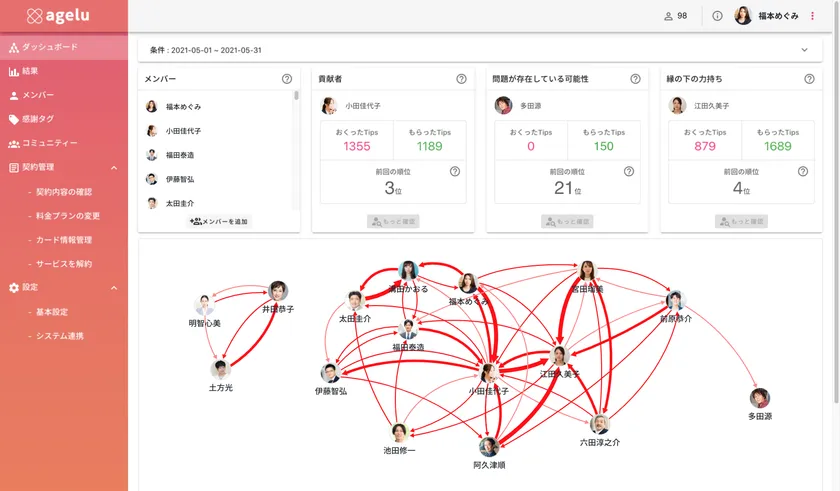 Ageluでは感謝のやり取りによって得られたデータを分析する機能があります。