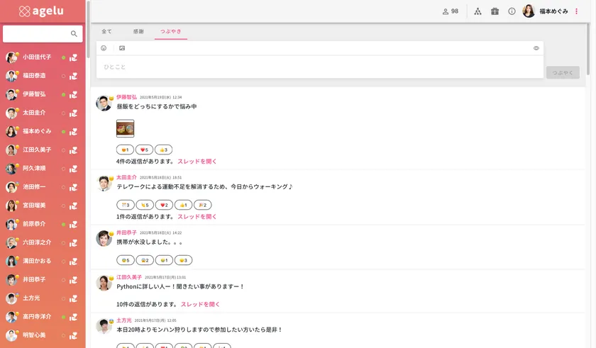 Ageluのつぶやき機能は誰でも自由に投稿することができ、投稿を見た社員はコメントや絵文字によるリアクションが可能です。写真を添付することも出来る為、気軽なコミュニケーションを実現でき社員感の交流を加速させます。