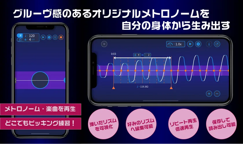 本アプリは、スマートフォン上でのピッキング動作を記録し、記録したリズムを可視化したり、リズムを編集してオリジナルメトロノームを創作・再生したりなど、これまで感覚で覚えてきたギター・ベースのトレーニングを定量化することで、個別最適化されたトレーニングを実践していくことができます。