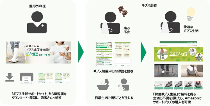 アルケアは、国産初のギプス包帯の開発・製造に成功して以来、数々のギプス製品を販売してきました。しかし、多くのギプス患者さんが不便な生活を強いられていることを目の当たりにし、患者さんはギプス生活のサポートとなる情報を必要としていると考えました。このたび公開した医師向け情報サイト「ギプス生活サポートサイト」では、ギプス生活に関する指導箋をダウンロード・印刷し、ギプス処置後の患者さんにお渡しいただくことが可能です。また、リニューアル公開した患者さん向け情報サイト「快適ギプス生活」は、ギプス生活で困りごとが生じている患者さんに、少しでも快適に生活していただけるよう、ギプス治療の目的をはじめ、ギプス生活の困りごとへの対処方法、注意点に関するコンテンツを新たに掲載しております。