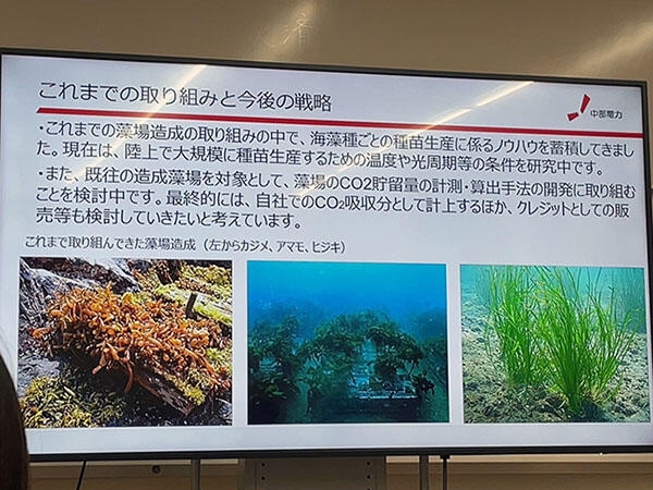 こうした課題を踏まえて、中部電力との勉強会や先端技術応用研究所への訪問、篠島で漁師さんへのヒアリング・藻場の視察などを行い、学生で課題解決に向けたアイデアを出し合いました。磯焼けの原因となる「ガンガゼ(ウニの一種)をおいしく食べる方法」「ガンガゼを捕食する魚(アイゴとかクロダイ)を増やす」などの案もありましたが、最終的に最も実現できそうな藻場の造成を目指すこととなりました。