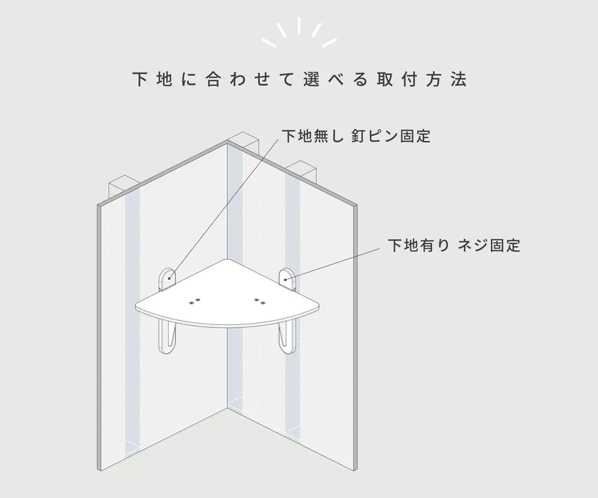 ・壁材の下地があるところ、無いところでも設置が可能。