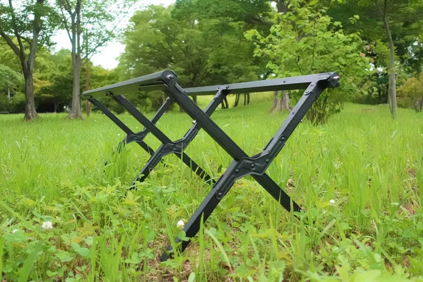折り畳み式の脚フレームは軽くて丈夫なアルミニウム合金。艶消しブラックが木目の天板とマッチします。