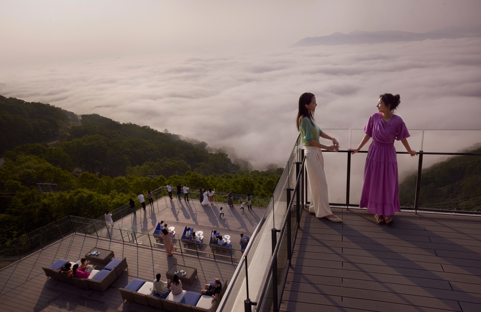雲海テラスは、トマム山の標高1,088メートルにあり、気象条件がそろった時に流れ込むダイナミックな雲海を間近で観賞する展望施設です。ゴンドラ整備のスタッフにとっては見慣れた風景だった雲海をお客様にも見てもらいたいという思いから誕生。2006年の開業以来、130万人を超えるお客さまが訪れています。さらに、2021年8月にはリニューアルオープンし、3階建ての展望デッキから今まで以上に雲海と山々の景色を見渡せるようになりました。雲海ゴンドラに乗って片道約13分で手軽にアクセスでき、営業期間中に、雲海が発生する確率は約40パーセントです。