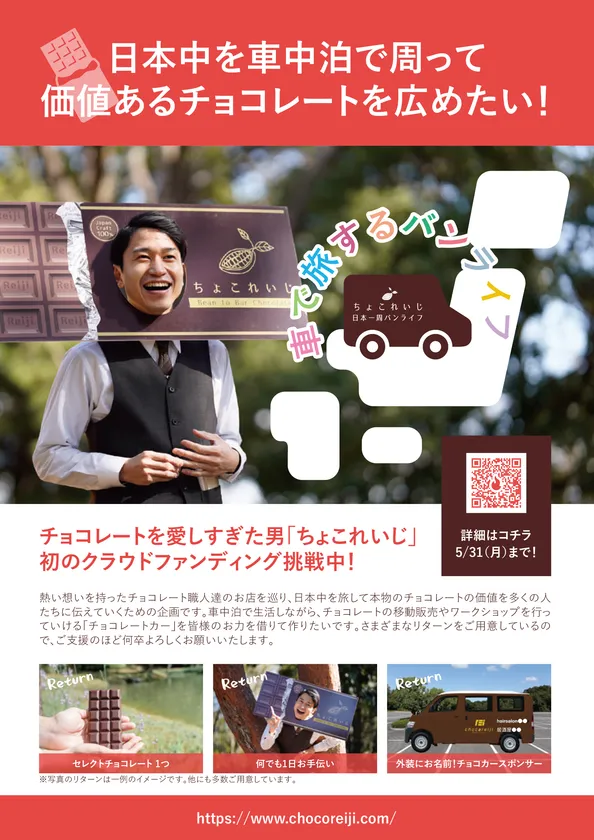 日本中を車中泊で周って価値あるチョコレートを広めたいという想いで活動している「ちょこれいじ」(本名:野口麗次、所在地:佐賀県)は、クラウドファンディングプラットフォームCAMPFIREにて「【チョコレートカーを作りたい】日本中のチョコレート店を車中泊で巡る旅へ」プロジェクトを2021年5月31日まで実施します。