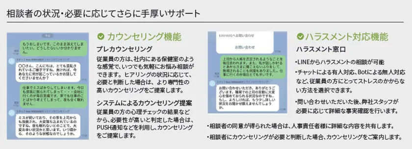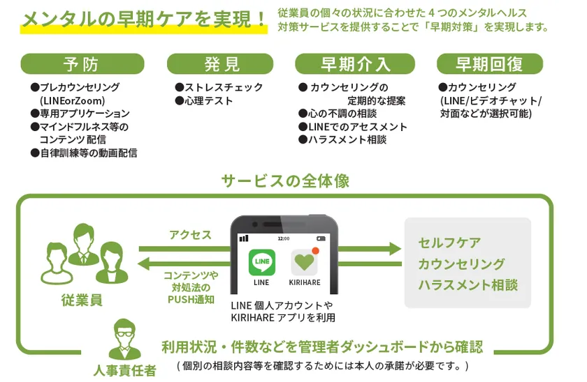 高ストレス状態であることを従業員自身が自覚できず、自ら対処できない場合、KIRIHARE側がメンタルヘルスの状態を検知し、LINEのプッシュ通知を使って、セルフケアの促進やカウンセリングを提案し、メンタルヘルスの悪化を防ぎます。